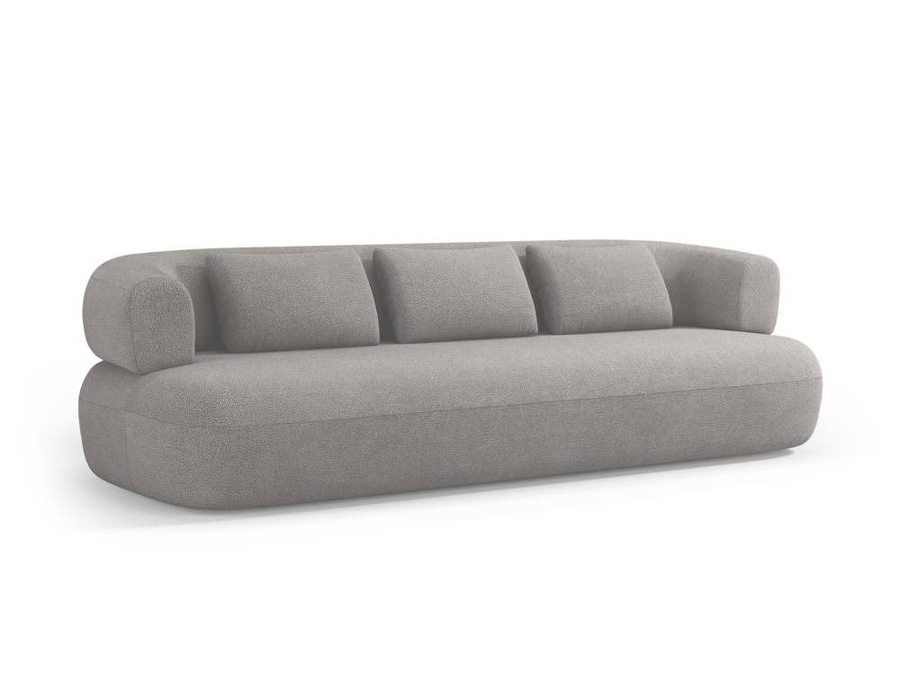 Es ist ein Bouclé-Polsterstoff mit einer weichen, gekräuselten Optik, die an Lammfell erinnert. Die Textur entsteht durch unregelmäßige Erhebungen und Schlaufen aus dekorativ gedrehten Garnen. Die Unregelmäßigkeiten sind fühlbar, aber dennoch glatt und angenehm. Die leicht glänzende Oberfläche verleiht modernen Möbeln Komfort und eine warme, elegante Ausstrahlung.